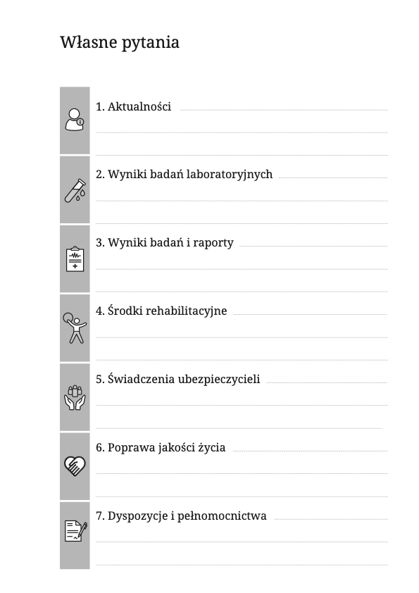 Regularnie otrzymują Państwo wyniki badań, a także listy lekarskie lub raporty z operacji. Ich zbieranie jest ważne i pomoże w długoterminowym leczeniu Państwa choroby.