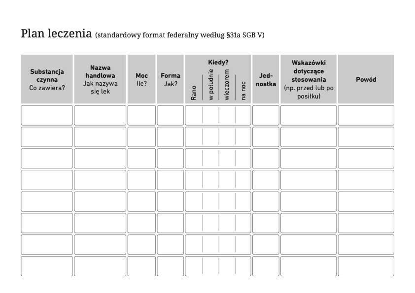 Plan leczenia pomaga Państwu w określeniu, kiedy, ile i jak często należy przyjmować leki. Ważne jest również, aby zapisać informacje na temat leków, które zostały zakupione samodzielnie, np. preparatów roślinnych.
