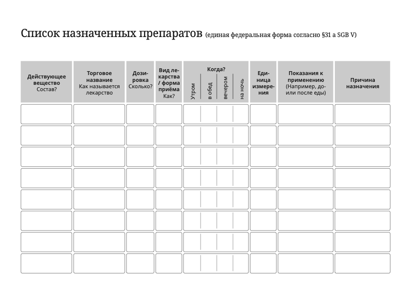 План приёма лекарств часто выдается Вам после госпитализации или Вашими врачами. Упрощённый пример Вы можете найти здесь. Он основан на стандартизированном национальном формате в соответствии с § 31a SGB V.