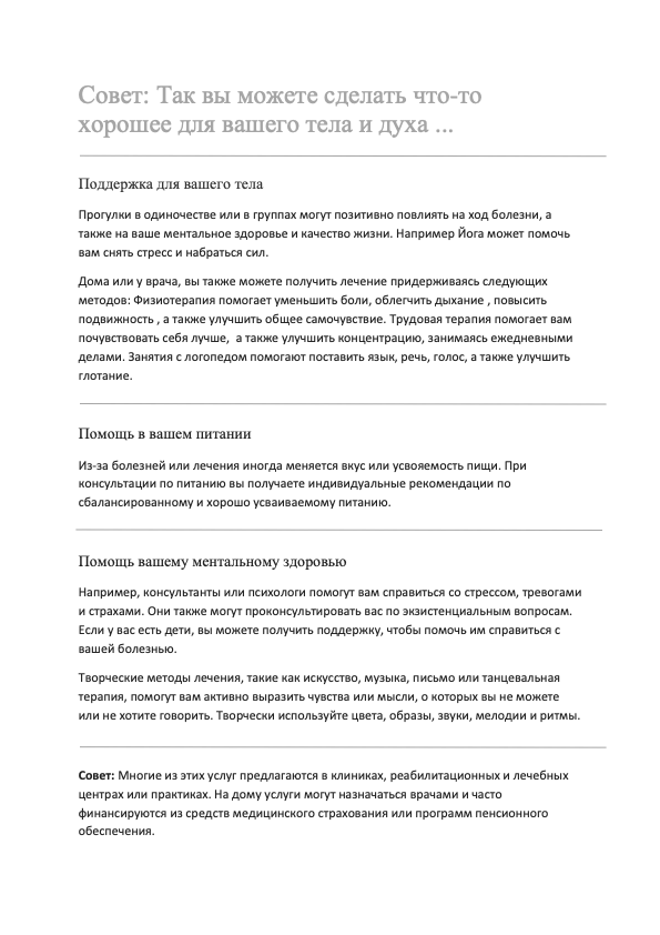 Поддержите Ваше физическое и психическое состояние различной деятельностью и той терапией, которая Вам нравится и улучшает Ваше самочувствие и качество жизни. Такие предложения называются поддерживающими. Испытайте то, что Вам подходит.
