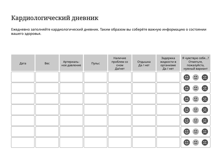 План приёма лекарств поможет Вам узнать, когда, сколько и как часто Вам нужно принимать лекарства. Здесь также важно записывать информацию о самостоятельно приобретенных средствах, например о растительных препаратах