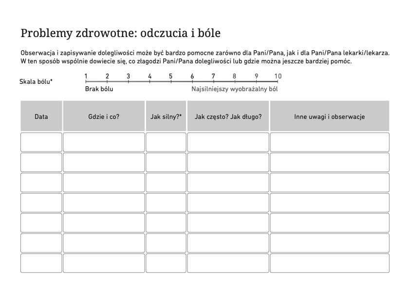 Jeśli dolegliwości, takie jak ból, występują częściej, ważne jest, aby je zapisywać. W ten sposób będą Państwo w stanie dokładnie opisać podczas wizyty lekarskiej, kiedy i jakie dolegliwości się pojawiają, oraz wspólnie rozważyć, co może pomóc. W sekcji do pobrania znajdą Państwo formularz do tego celu.